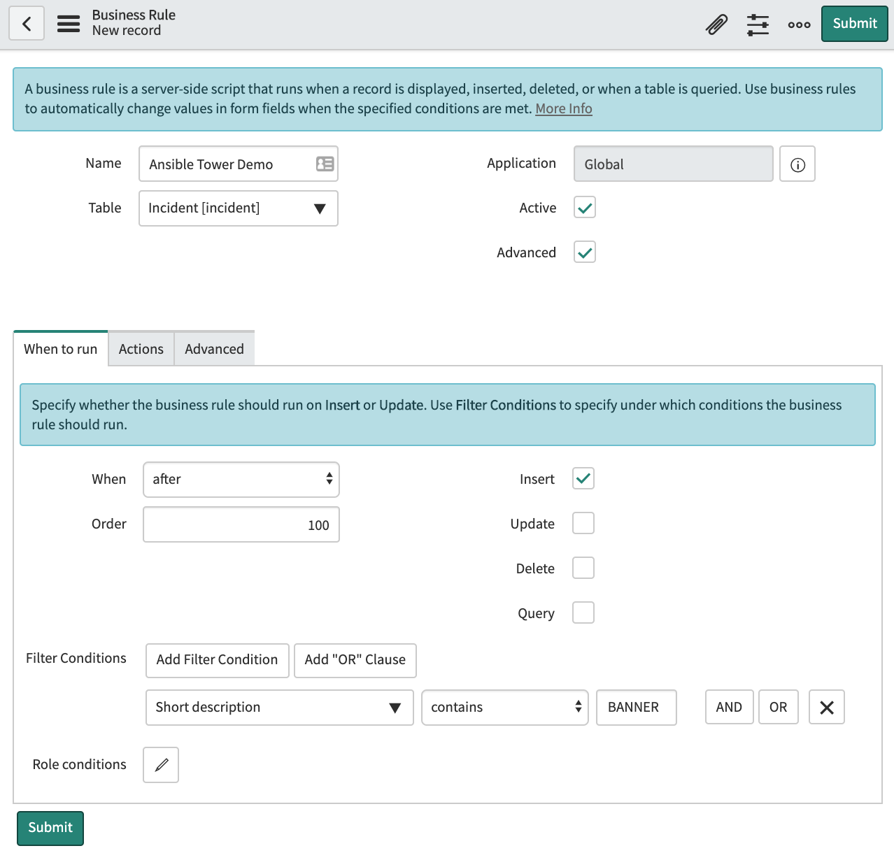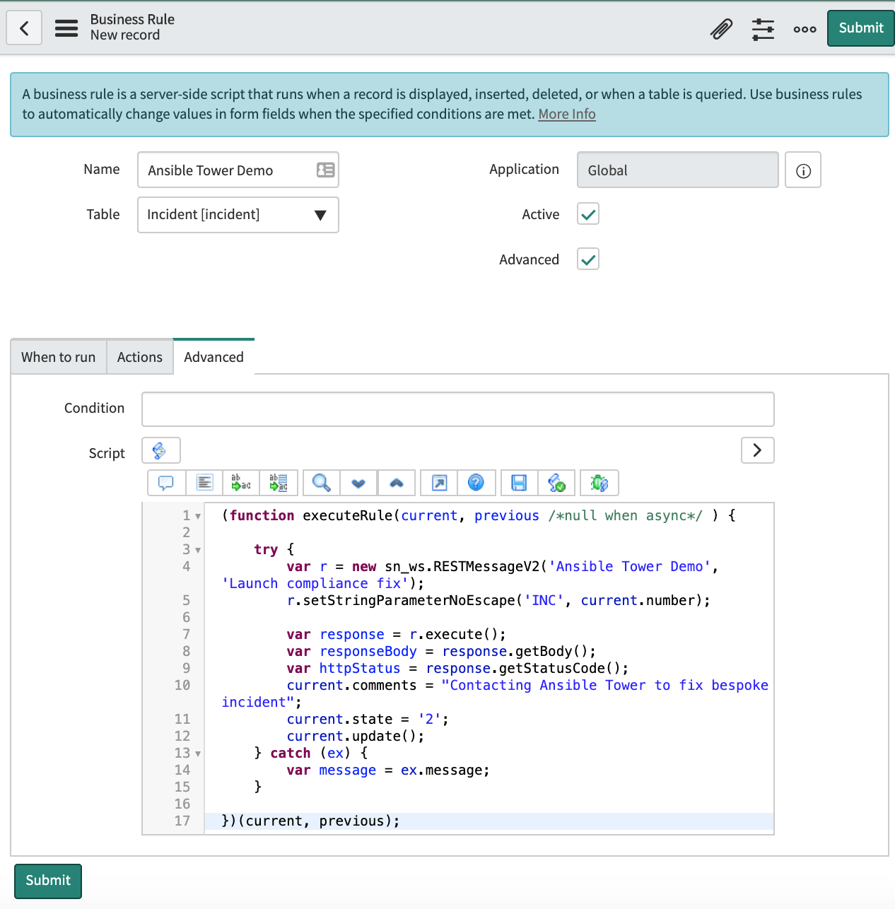 The extra_vars is how the ServiceNow API is going to pass the incident number information to the Ansible Tower instance